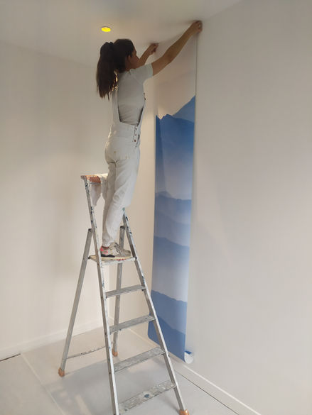 Pose de papier peint panoramique chez un particulier avec José Rojas. Paris, 13è arrondissement, août 2024.